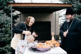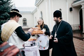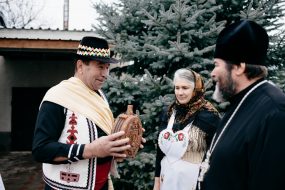 The first stop on their route will be the church. The priest awaits them there. They solemnly enter the churchyard (because it is forbidden to play instruments inside the church) and they sing sharing their joy with the priest. And in his turn, he blesses them in this rite: “Congratulate all people” and brings them the gift of Christmas bread and a bottle of sparkling wine. The blessing of the priest means that they can go out into the village to greet people. In people’s courtyards, things happen in exactly the same way.